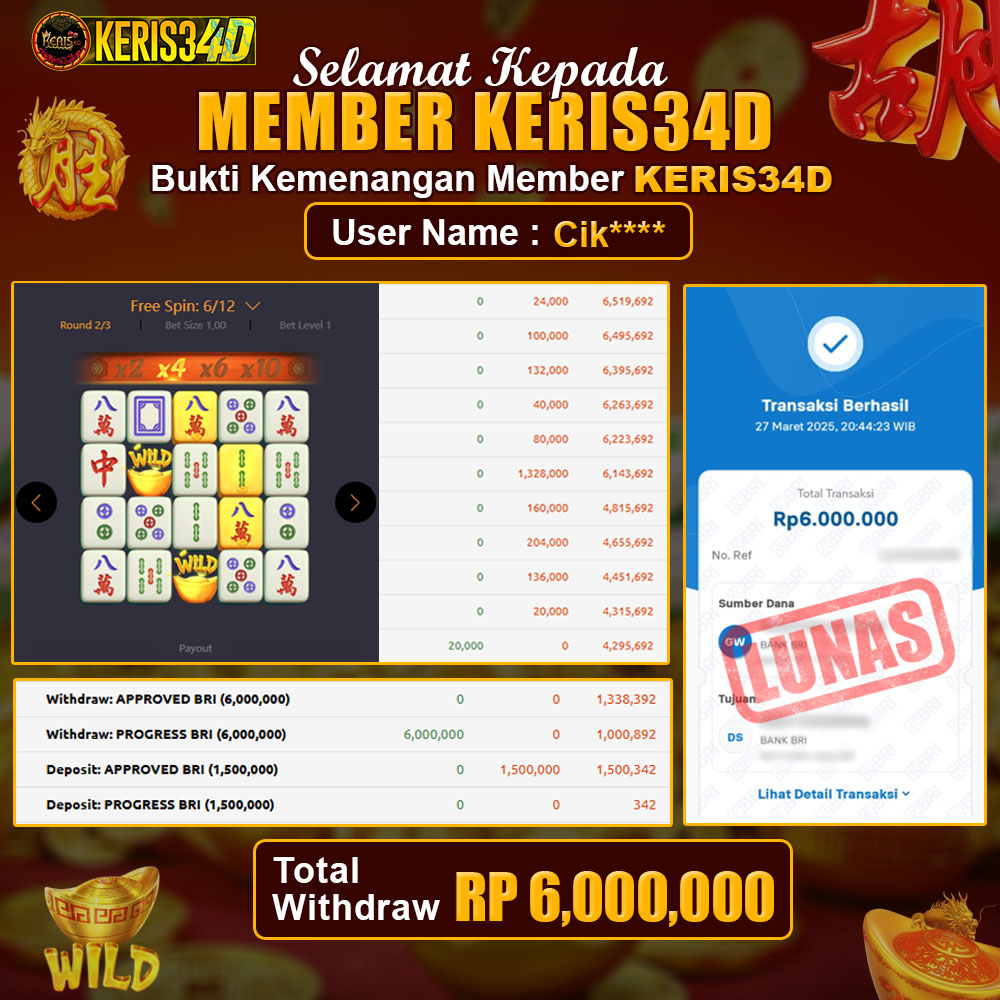 Setiap hari, member KERIS34D berhasil meraih jackpot besar dari berbagai provider slot ternama yang kami sediakan, seperti Pragmatic Play, Habanero, PG Soft, dan masih banyak lagi. Kami secara rutin menampilkan bukti screenshot atau rekapan kemenangan yang berhasil diraih, mulai dari kemenangan ratusan ribu hingga puluhan juta rupiah. Semua slip kemenangan ini kami hadirkan untuk membuktikan bahwa di KERIS34D, peluang menang itu nyata.