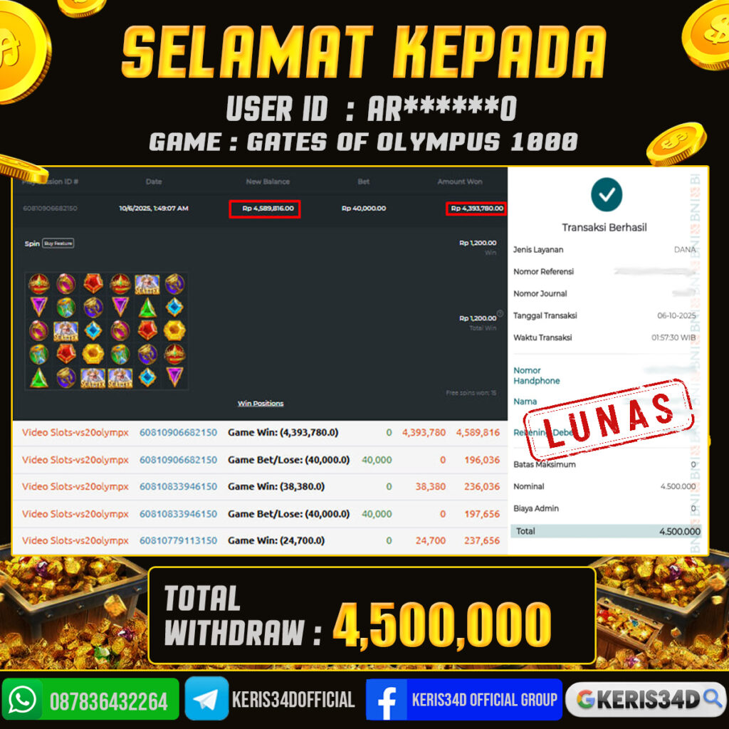 Setiap hari, member KERIS34D berhasil meraih jackpot besar dari berbagai provider slot ternama yang kami sediakan, seperti Pragmatic Play, Habanero, PG Soft, dan masih banyak lagi. Kami secara rutin menampilkan bukti screenshot atau rekapan kemenangan yang berhasil diraih, mulai dari kemenangan ratusan ribu hingga puluhan juta rupiah. Semua slip kemenangan ini kami hadirkan untuk membuktikan bahwa di KERIS34D, peluang menang itu nyata