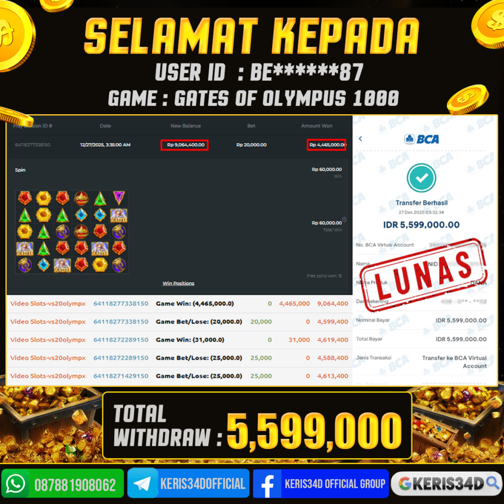Setiap hari, member KERIS34D berhasil meraih jackpot besar dari berbagai provider slot ternama yang kami sediakan, seperti Pragmatic Play, Habanero, PG Soft, dan masih banyak lagi. Kami secara rutin menampilkan bukti screenshot atau rekapan kemenangan yang berhasil diraih, mulai dari kemenangan ratusan ribu hingga puluhan juta rupiah. Semua slip kemenangan ini kami hadirkan untuk membuktikan bahwa di KERIS34D, peluang menang itu nyata