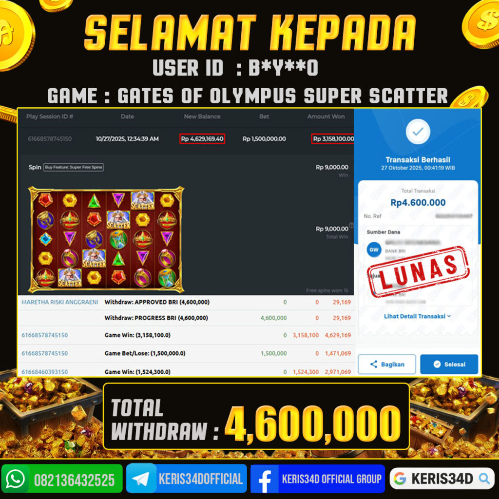 KERIS34D dikenal sebagai situs terpercaya yang selalu menghadirkan pengalaman bermain slot online yang aman, fair, dan berlisensi resmi. Di sini, kami tidak hanya sekadar memberikan janji, tapi bukti nyata berupa slip kemenangan yang dapat Anda lihat secara langsung.