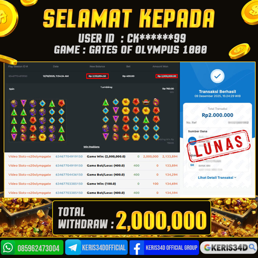 Setiap hari, member KERIS34D berhasil meraih jackpot besar dari berbagai provider slot ternama yang kami sediakan, seperti Pragmatic Play, Habanero, PG Soft, dan masih banyak lagi. Kami secara rutin menampilkan bukti screenshot atau rekapan kemenangan yang berhasil diraih, mulai dari kemenangan ratusan ribu hingga puluhan juta rupiah. Semua slip kemenangan ini kami hadirkan untuk membuktikan bahwa di KERIS34D, peluang menang itu nyata