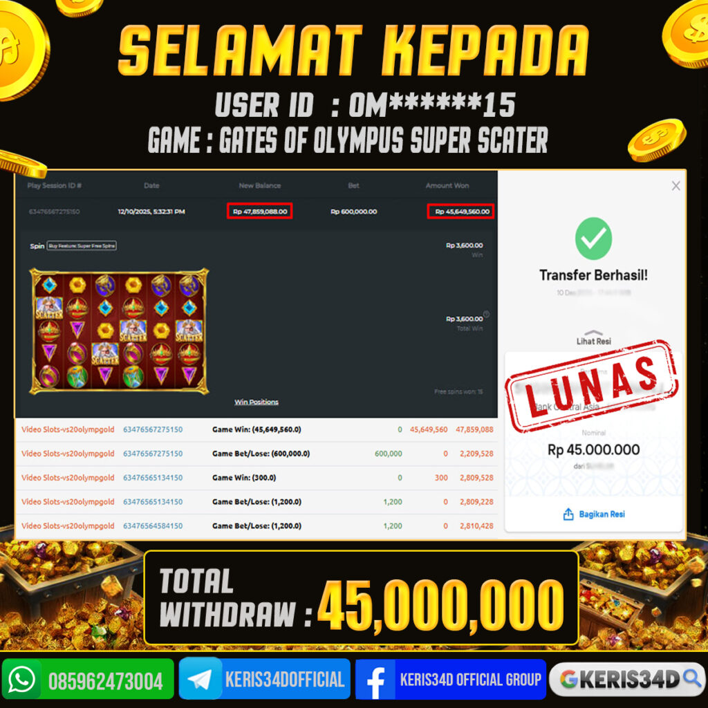 Setiap hari, member KERIS34D berhasil meraih jackpot besar dari berbagai provider slot ternama yang kami sediakan, seperti Pragmatic Play, Habanero, PG Soft, dan masih banyak lagi. Kami secara rutin menampilkan bukti screenshot atau rekapan kemenangan yang berhasil diraih, mulai dari kemenangan ratusan ribu hingga puluhan juta rupiah. Semua slip kemenangan ini kami hadirkan untuk membuktikan bahwa di KERIS34D, peluang menang itu nyata