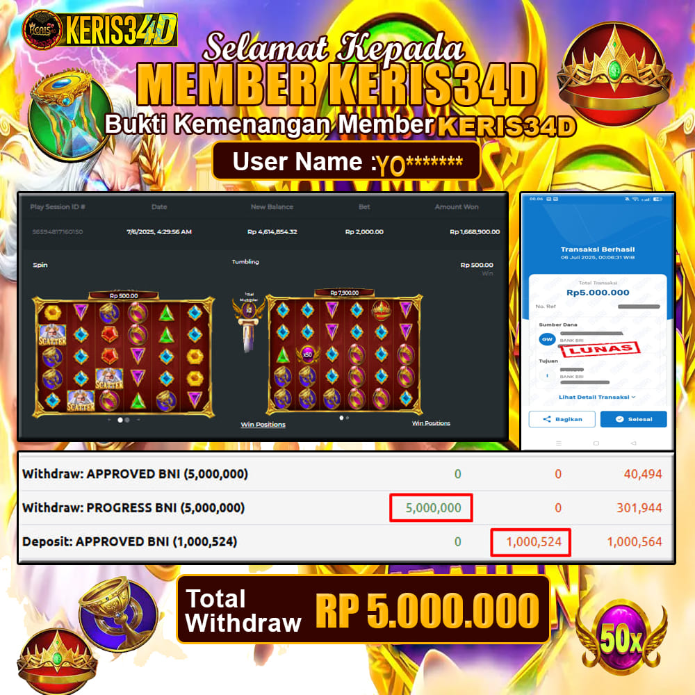 Setiap hari, member KERIS34D berhasil meraih jackpot besar dari berbagai provider slot ternama yang kami sediakan, seperti Pragmatic Play, Habanero, PG Soft, dan masih banyak lagi. Kami secara rutin menampilkan bukti screenshot atau rekapan kemenangan yang berhasil diraih, mulai dari kemenangan ratusan ribu hingga puluhan juta rupiah. Semua slip kemenangan ini kami hadirkan untuk membuktikan bahwa di KERIS34D peluang menang itu nyata
