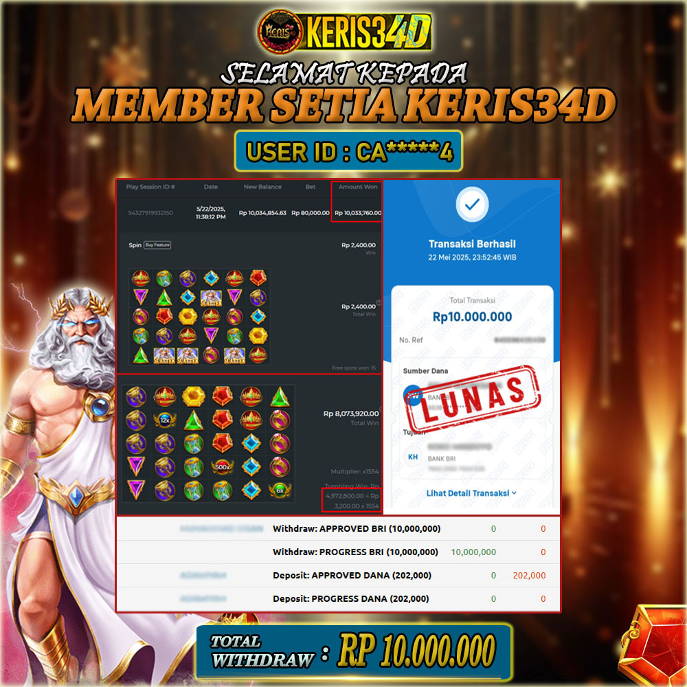 SSetiap hari, member KERIS34D berhasil meraih jackpot besar dari berbagai provider slot ternama yang kami sediakan, seperti Pragmatic Play, Habanero, PG Soft, dan masih banyak lagi. Kami secara rutin menampilkan bukti screenshot atau rekapan kemenangan yang berhasil diraih, mulai dari kemenangan ratusan ribu hingga puluhan juta rupiah. Semua slip kemenangan ini kami hadirkan untuk membuktikan bahwa di KERIS34D, peluang menang itu nyata