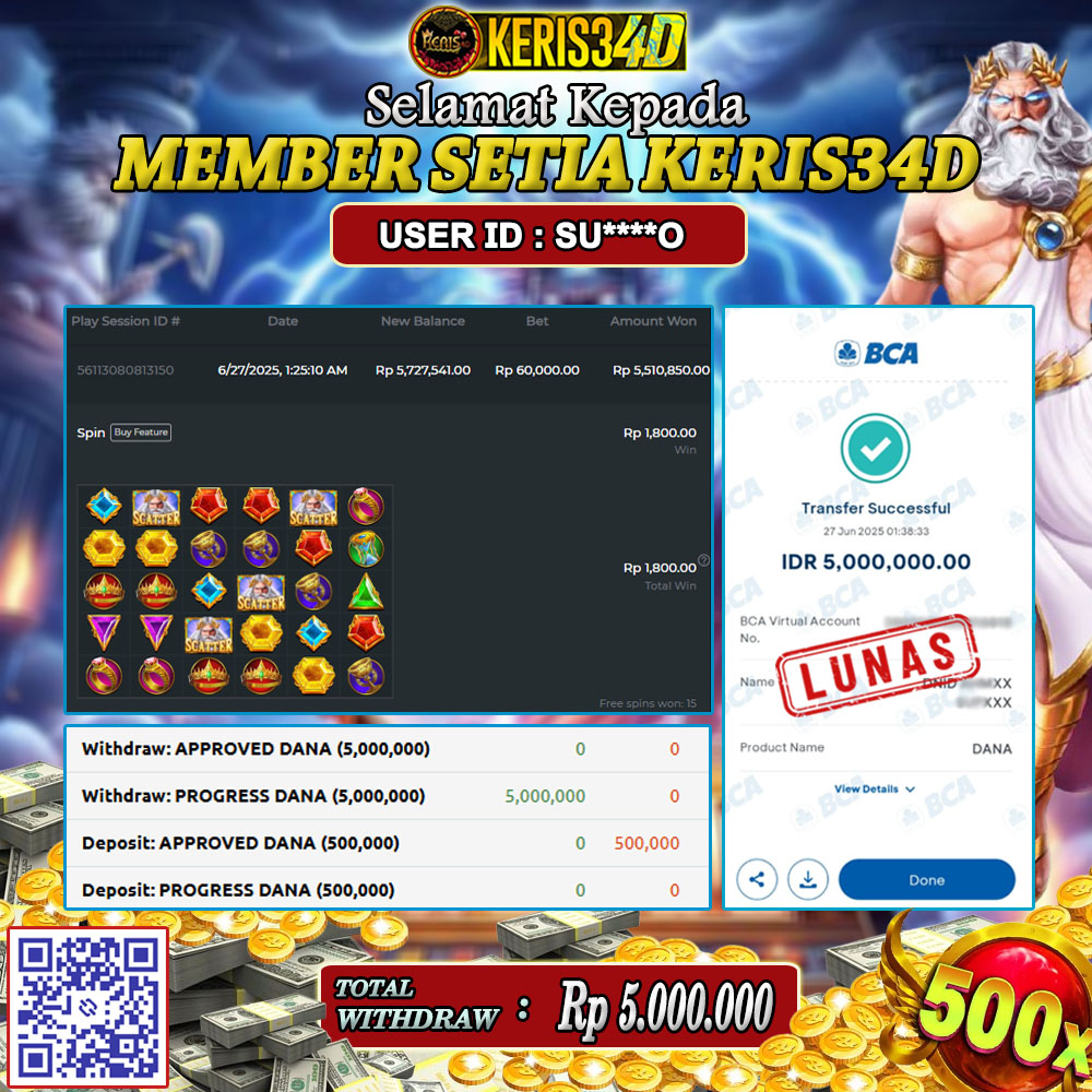 SSetiap hari, member KERIS34D berhasil meraih jackpot besar dari berbagai provider slot ternama yang kami sediakan, seperti Pragmatic Play, Habanero, PG Soft, dan masih banyak lagi. Kami secara rutin menampilkan bukti screenshot atau rekapan kemenangan yang berhasil diraih, mulai dari kemenangan ratusan ribu hingga puluhan juta rupiah. Semua slip kemenangan ini kami hadirkan untuk membuktikan bahwa di KERIS34D peluang menang itu nyata