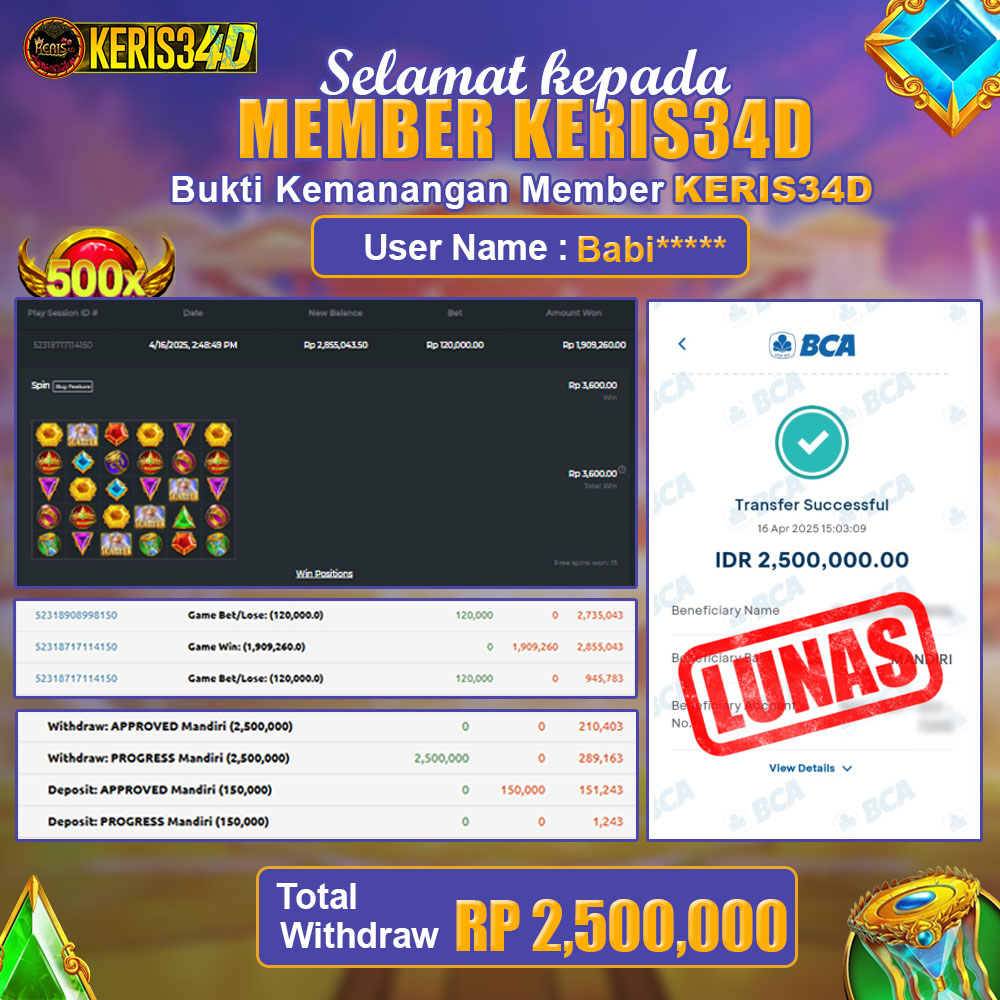 Setiap hari, member KERIS34D berhasil meraih jackpot besar dari berbagai provider slot ternama yang kami sediakan, seperti Pragmatic Play, Habanero, PG Soft, dan masih banyak lagi. Kami secara rutin menampilkan bukti screenshot atau rekapan kemenangan yang berhasil diraih, mulai dari kemenangan ratusan ribu hingga puluhan juta rupiah. Semua slip kemenangan ini kami hadirkan untuk membuktikan bahwa di KERIS34D, peluang menang itu nyata