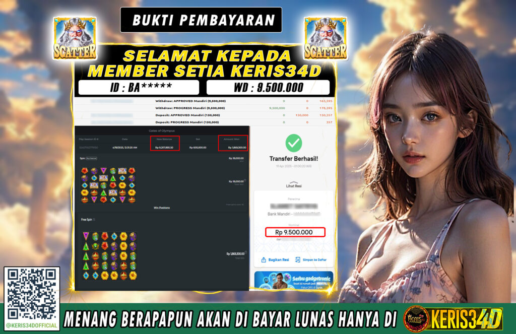 Setiap hari, member KERIS34D berhasil meraih jackpot besar dari berbagai provider slot ternama yang kami sediakan, seperti Pragmatic Play, Habanero, PG Soft, dan masih banyak lagi. Kami secara rutin menampilkan bukti screenshot atau rekapan kemenangan yang berhasil diraih, mulai dari kemenangan ratusan ribu hingga puluhan juta rupiah. Semua slip kemenangan ini kami hadirkan untuk membuktikan bahwa di KERIS34D, peluang menang itu nyata
