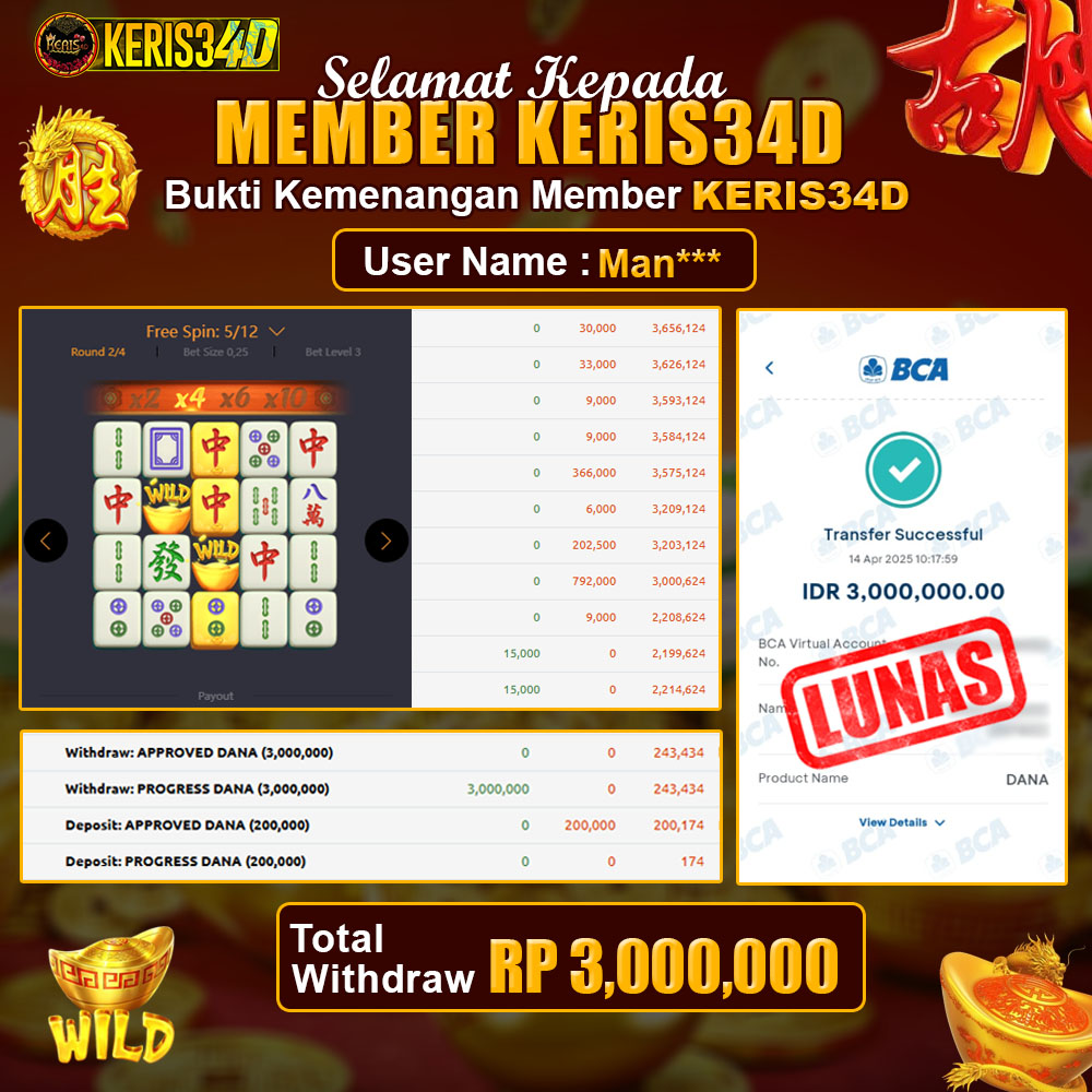 Setiap hari, member KERIS34D berhasil meraih jackpot besar dari berbagai provider slot ternama yang kami sediakan, seperti Pragmatic Play, Habanero, PG Soft, dan masih banyak lagi. Kami secara rutin menampilkan bukti screenshot atau rekapan kemenangan yang berhasil diraih, mulai dari kemenangan ratusan ribu hingga puluhan juta rupiah. Semua slip kemenangan ini kami hadirkan untuk membuktikan bahwa di KERIS34D, peluang menang itu nyata