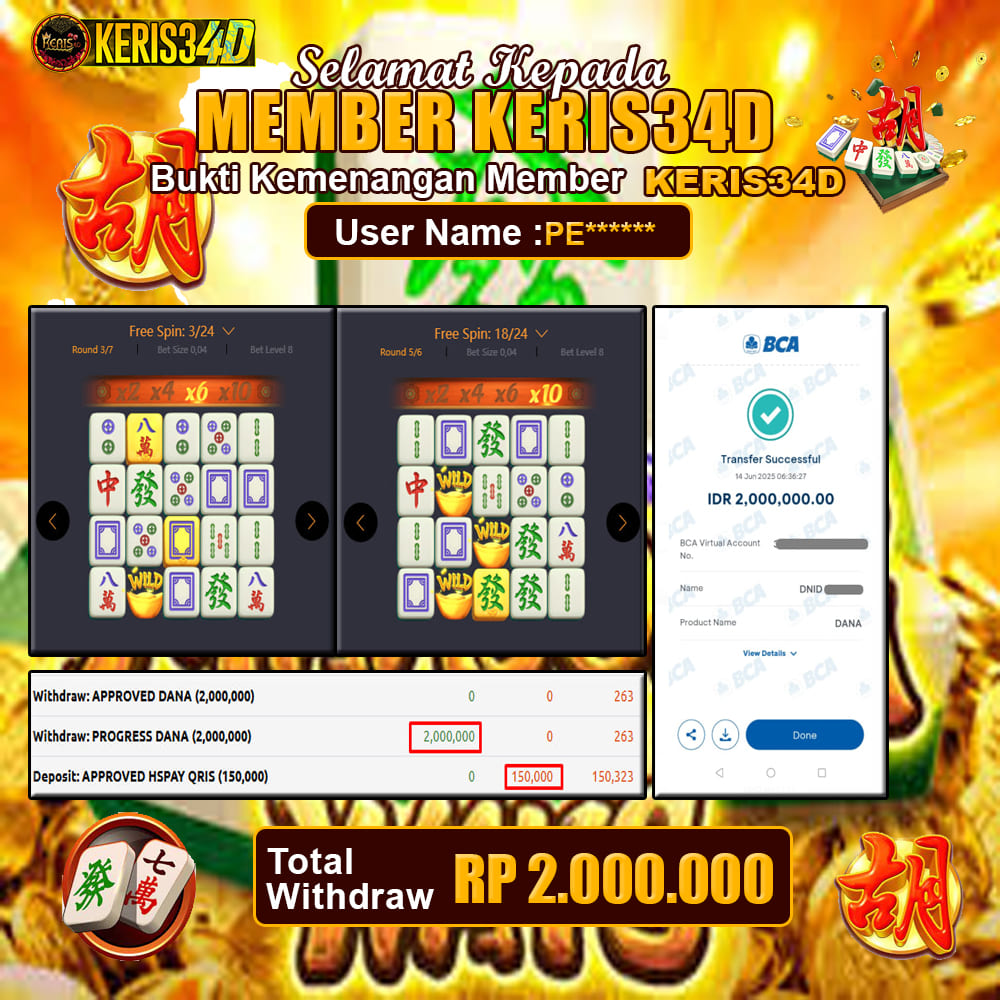 Setiap hari, member KERIS34D berhasil meraih jackpot besar dari berbagai provider slot ternama yang kami sediakan, seperti Pragmatic Play, Habanero, PG Soft, dan masih banyak lagi. Kami secara rutin menampilkan bukti screenshot atau rekapan kemenangan yang berhasil diraih, mulai dari kemenangan ratusan ribu hingga puluhan juta rupiah. Semua slip kemenangan ini kami hadirkan untuk membuktikan bahwa di KERIS34D, peluang menang itu nyata