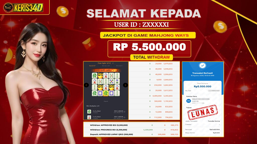 Setiap hari, member KERIS34D berhasil meraih jackpot besar dari berbagai provider slot ternama yang kami sediakan, seperti Pragmatic Play, Habanero, PG Soft, dan masih banyak lagi. Kami secara rutin menampilkan bukti screenshot atau rekapan kemenangan yang berhasil diraih, mulai dari kemenangan ratusan ribu hingga puluhan juta rupiah. Semua slip kemenangan ini kami hadirkan untuk membuktikan bahwa di KERIS34D, peluang menang itu nyata