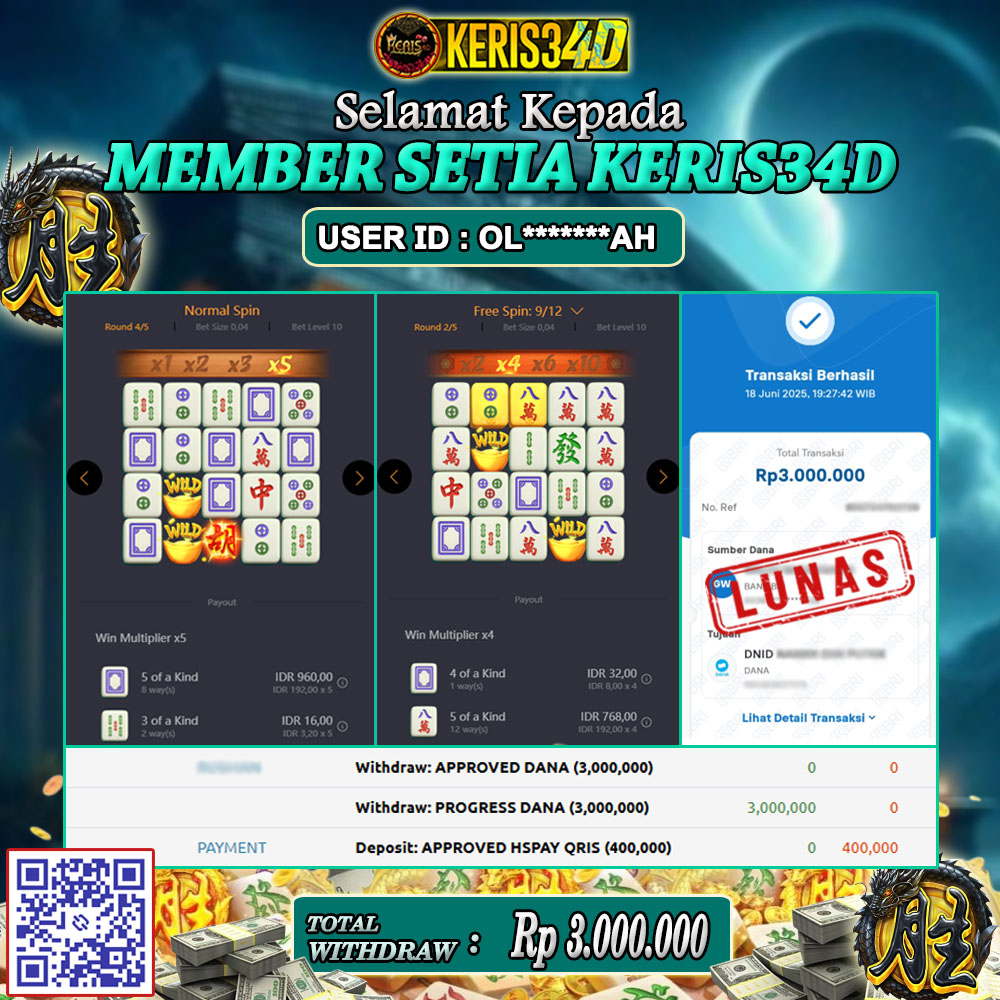 Setiap hari, member KERIS34D berhasil meraih jackpot besar dari berbagai provider slot ternama yang kami sediakan, seperti Pragmatic Play, Habanero, PG Soft, dan masih banyak lagi. Kami secara rutin menampilkan bukti screenshot atau rekapan kemenangan yang berhasil diraih, mulai dari kemenangan ratusan ribu hingga puluhan juta rupiah. Semua slip kemenangan ini kami hadirkan untuk membuktikan bahwa di KERIS34D, peluang menang itu nyata