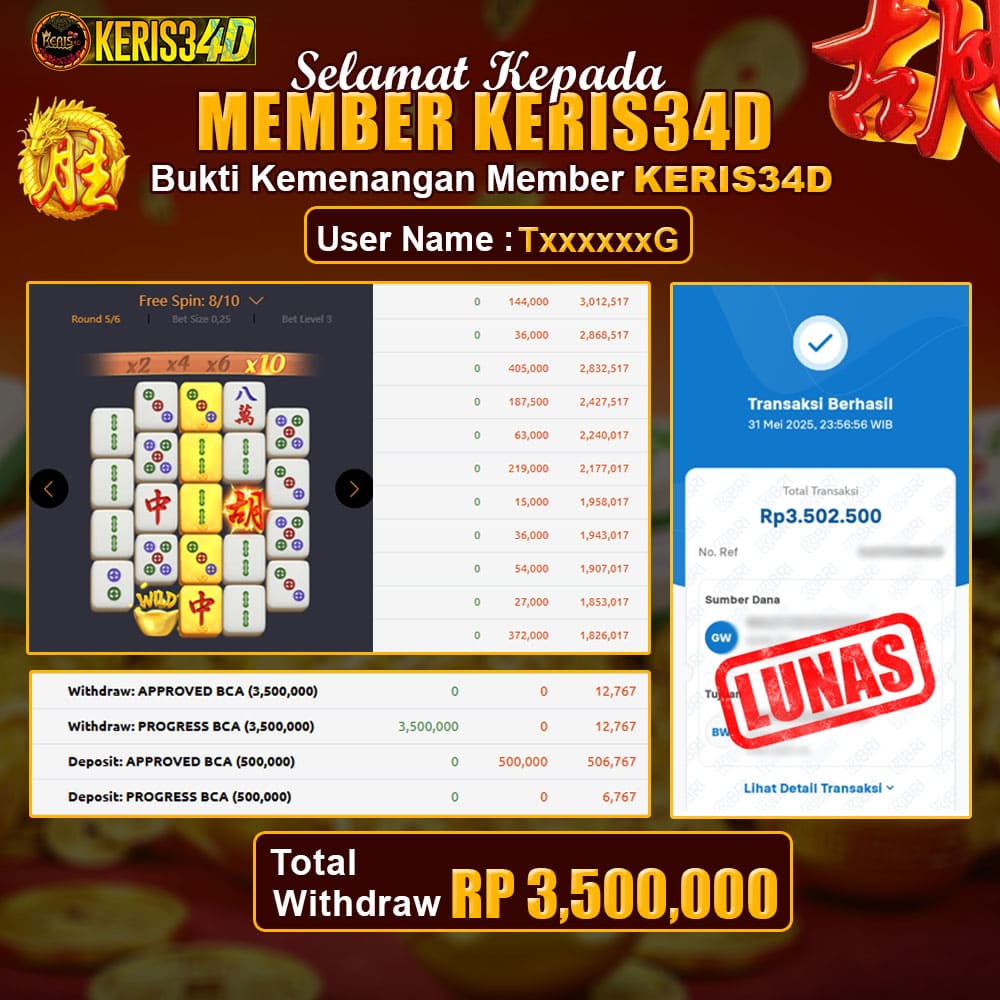 Setiap hari, member KERIS34D berhasil meraih jackpot besar dari berbagai provider slot ternama yang kami sediakan, seperti Pragmatic Play, Habanero, PG Soft, dan masih banyak lagi. Kami secara rutin menampilkan bukti screenshot atau rekapan kemenangan yang berhasil diraih, mulai dari kemenangan ratusan ribu hingga puluhan juta rupiah. Semua slip kemenangan ini kami hadirkan untuk membuktikan bahwa di KERIS34D, peluang menang itu nyata