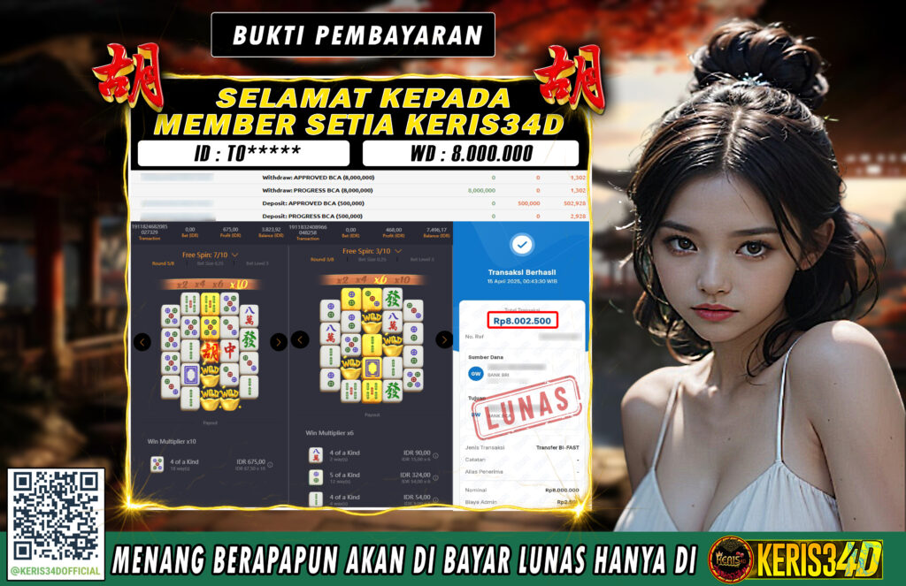 KERIS34D dikenal sebagai situs terpercaya yang selalu menghadirkan pengalaman bermain slot online yang aman, fair, dan berlisensi resmi. Di sini, kami tidak hanya sekadar memberikan janji, tapi bukti nyata berupa slip kemenangan yang dapat Anda lihat secara langsung.