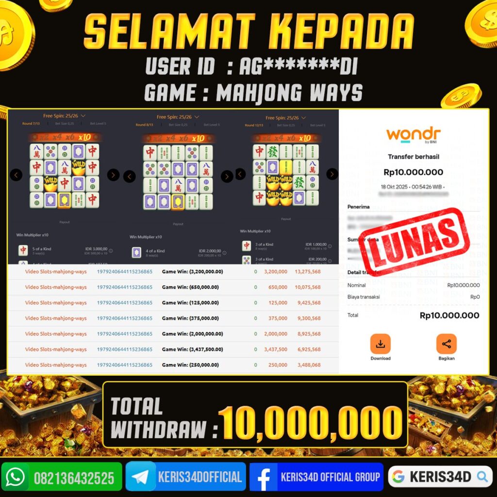 KERIS34D dikenal sebagai situs terpercaya yang selalu menghadirkan pengalaman bermain slot online yang aman, fair, dan berlisensi resmi. Di sini, kami tidak hanya sekadar memberikan janji, tapi bukti nyata berupa slip kemenangan yang dapat Anda lihat secara langsung.