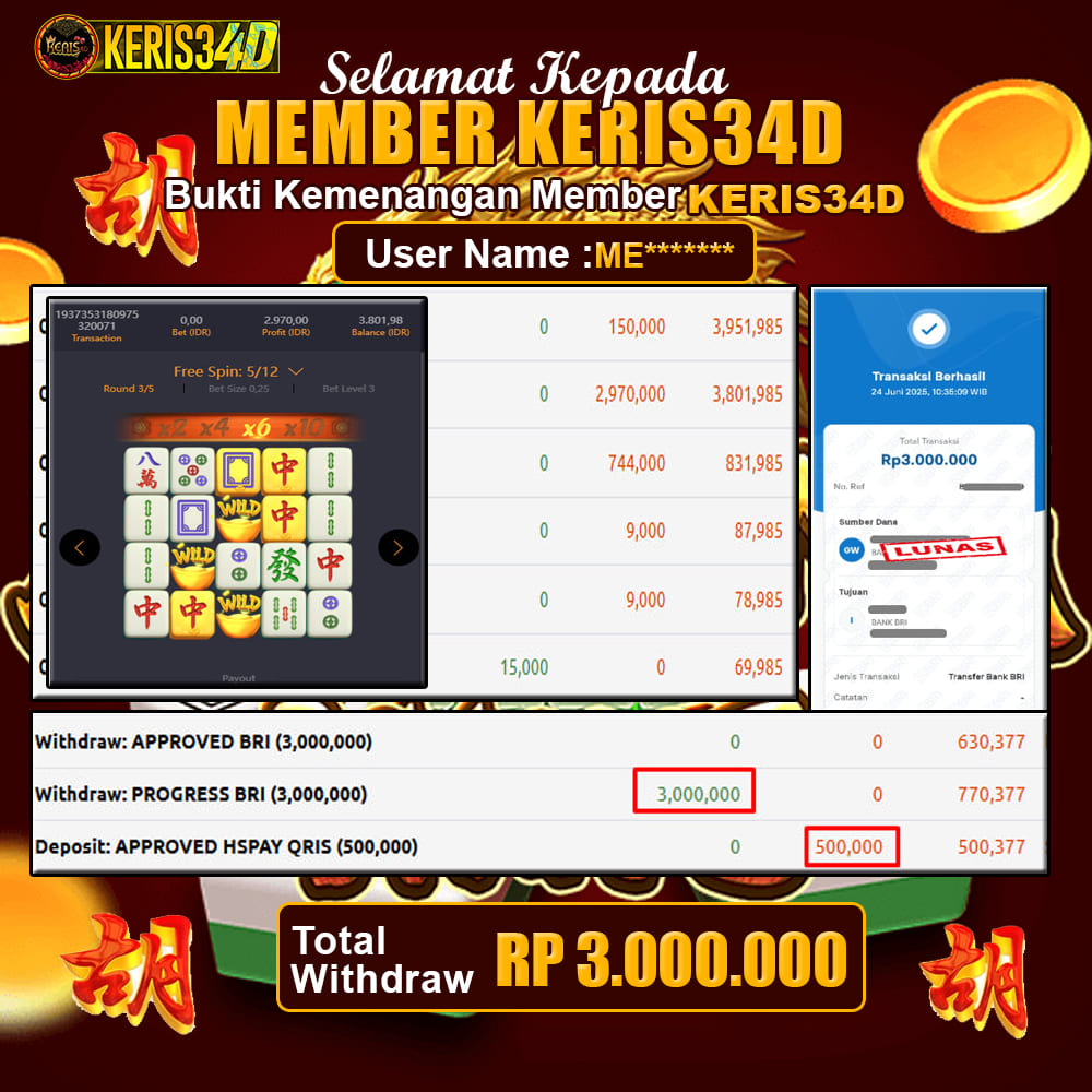 Setiap hari, member KERIS34D berhasil meraih jackpot besar dari berbagai provider slot ternama yang kami sediakan, seperti Pragmatic Play, Habanero, PG Soft, dan masih banyak lagi. Kami secara rutin menampilkan bukti screenshot atau rekapan kemenangan yang berhasil diraih, mulai dari kemenangan ratusan ribu hingga puluhan juta rupiah. Semua slip kemenangan ini kami hadirkan untuk membuktikan bahwa di KERIS34D, peluang menang itu nyata