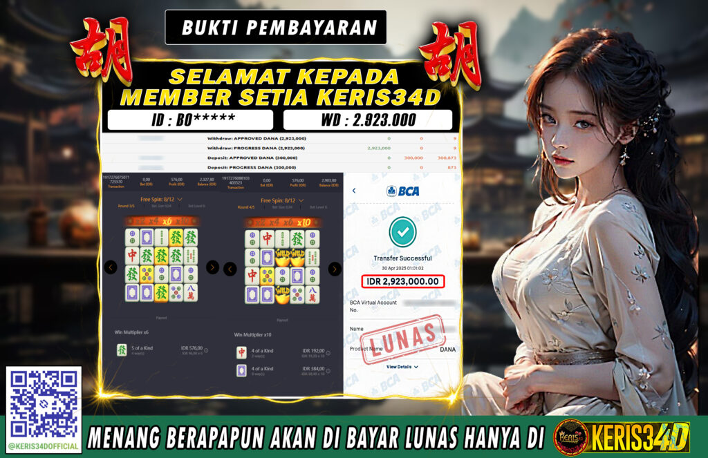 Setiap hari, member KERIS34D berhasil meraih jackpot besar dari berbagai provider slot ternama yang kami sediakan, seperti Pragmatic Play, Habanero, PG Soft, dan masih banyak lagi. Kami secara rutin menampilkan bukti screenshot atau rekapan kemenangan yang berhasil diraih, mulai dari kemenangan ratusan ribu hingga puluhan juta rupiah. Semua slip kemenangan ini kami hadirkan untuk membuktikan bahwa di KERIS34D, peluang menang itu nyata