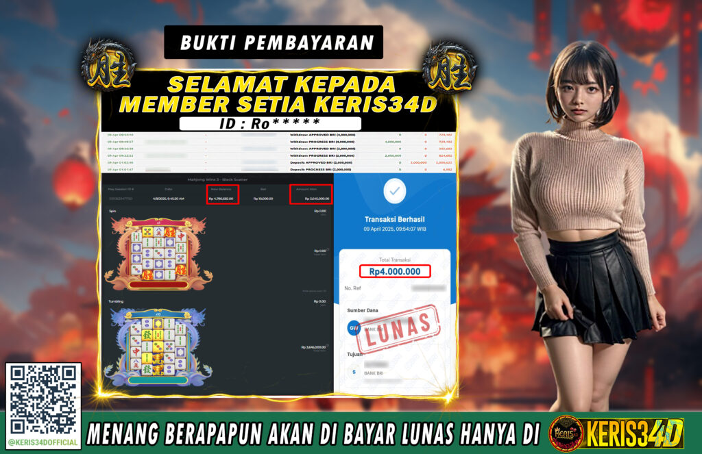 Setiap hari, member KERIS34D berhasil meraih jackpot besar dari berbagai provider slot ternama yang kami sediakan, seperti Pragmatic Play, Habanero, PG Soft, dan masih banyak lagi. Kami secara rutin menampilkan bukti screenshot atau rekapan kemenangan yang berhasil diraih, mulai dari kemenangan ratusan ribu hingga puluhan juta rupiah. Semua slip kemenangan ini kami hadirkan untuk membuktikan bahwa di KERIS34D, peluang menang itu nyata