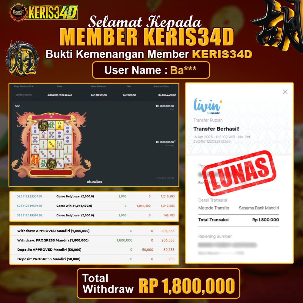 Setiap hari, member KERIS34D berhasil meraih jackpot besar dari berbagai provider slot ternama yang kami sediakan, seperti Pragmatic Play, Habanero, PG Soft, dan masih banyak lagi. Kami secara rutin menampilkan bukti screenshot atau rekapan kemenangan yang berhasil diraih, mulai dari kemenangan ratusan ribu hingga puluhan juta rupiah. Semua slip kemenangan ini kami hadirkan untuk membuktikan bahwa di KERIS34D, peluang menang itu nyata