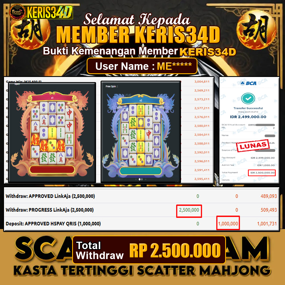 Setiap hari, member KERIS34D berhasil meraih jackpot besar dari berbagai provider slot ternama yang kami sediakan, seperti Pragmatic Play, Habanero, PG Soft, dan masih banyak lagi. Kami secara rutin menampilkan bukti screenshot atau rekapan kemenangan yang berhasil diraih, mulai dari kemenangan ratusan ribu hingga puluhan juta rupiah. Semua slip kemenangan ini kami ha