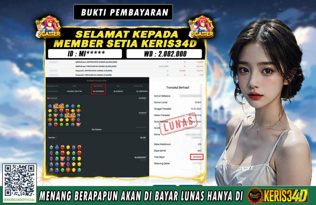 Setiap hari, member KERIS34D berhasil meraih jackpot besar dari berbagai provider slot ternama yang kami sediakan, seperti Pragmatic Play, Habanero, PG Soft, dan masih banyak lagi. Kami secara rutin menampilkan bukti screenshot atau rekapan kemenangan yang berhasil diraih, mulai dari kemenangan ratusan ribu hingga puluhan juta rupiah. Semua slip kemenangan ini kami hadirkan untuk membuktikan bahwa di KERIS34D, peluang menang itu nyata