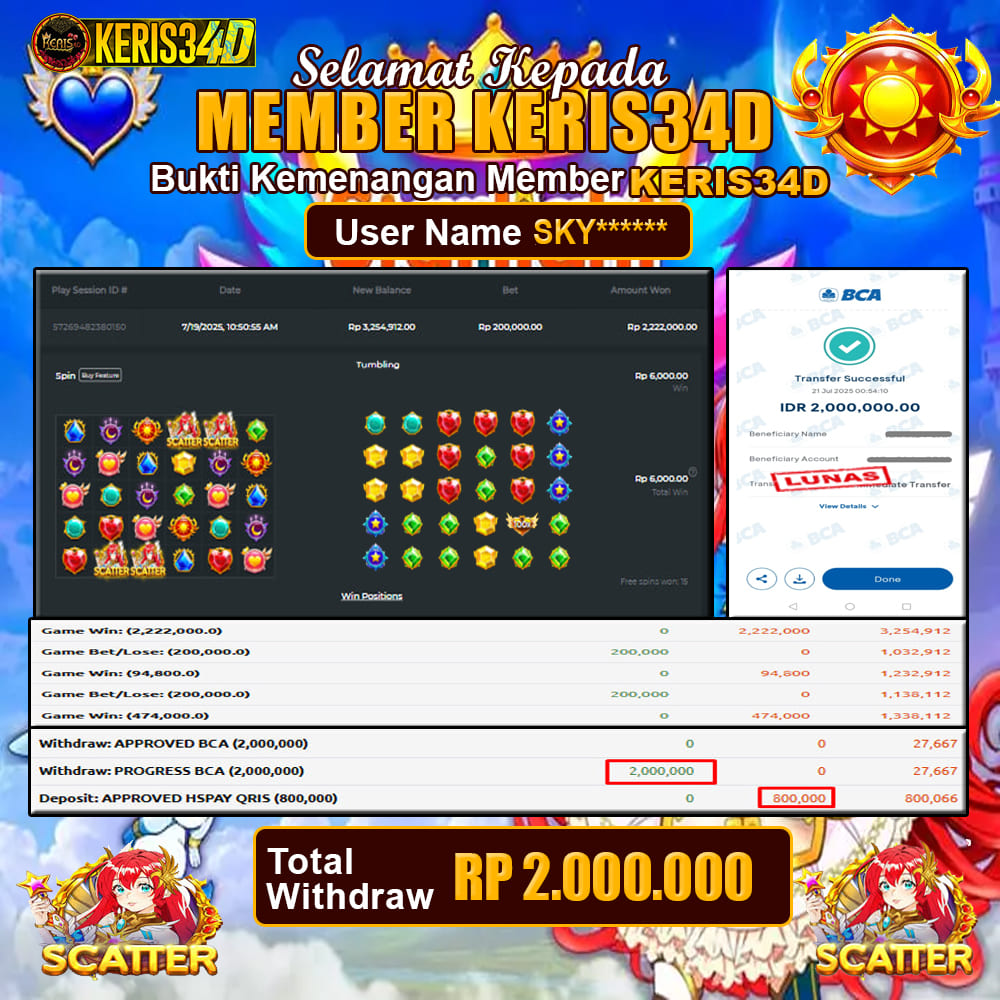 Setiap hari, member KERIS34D berhasil meraih jackpot besar dari berbagai provider slot ternama yang kami sediakan, seperti Pragmatic Play, Habanero, PG Soft, dan masih banyak lagi. Kami secara rutin menampilkan bukti screenshot atau rekapan kemenangan yang berhasil diraih, mulai dari kemenangan ratusan ribu hingga puluhan juta rupiah. Semua slip kemenangan ini kami hadirkan untuk membuktikan bahwa di KERIS34D, peluang menang itu nyata