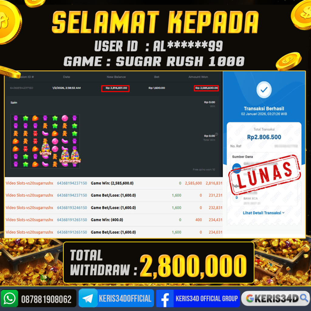 JACKPOT SLOT GACOR SUGAR RUSH 1000 02 JANUARI 2026, Jackpot Slot Gacor, Kemenangan Slot, Bukti Kemenangan Slot, Kemenangan PRAGMATIC PLAY, Menang Slot online, Slot Gacor, Situs Aman Terpercaya, WD Berapapun Pasti DI Bayar Tuntas, Maxwin Slot Online.