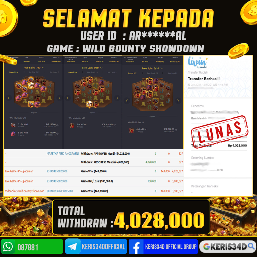 Setiap hari, member KERIS34D berhasil meraih jackpot besar dari berbagai provider slot ternama yang kami sediakan, seperti Pragmatic Play, Habanero, PG Soft, dan masih banyak lagi. Kami secara rutin menampilkan bukti screenshot atau rekapan kemenangan yang berhasil diraih, mulai dari kemenangan ratusan ribu hingga puluhan juta rupiah. Semua slip kemenangan ini kami hadirkan untuk membuktikan bahwa di KERIS34D, peluang menang itu nyata