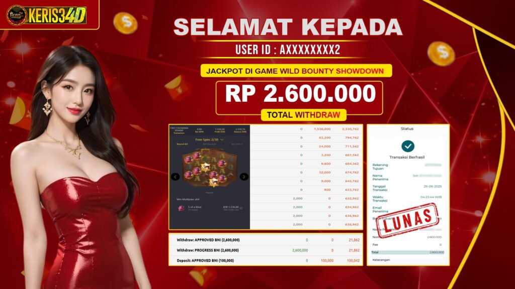 KERIS34D dikenal sebagai situs terpercaya yang selalu menghadirkan pengalaman bermain slot online yang aman, fair, dan berlisensi resmi. Di sini, kami tidak hanya sekadar memberikan janji, tapi bukti nyata berupa slip kemenangan yang dapat Anda lihat secara langsung.